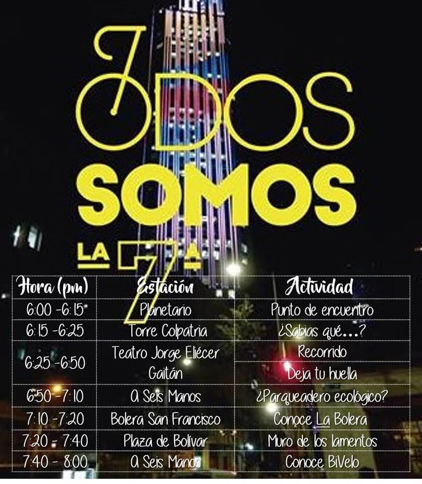 7:20 p.m. - Plaza de Bolívar (Muro de los lamentos): Interacción entre los ciudadanos, especialmente biciusuarios, quienes brindarán sus sugerencias e inconformidades acerca de la experiencia de movilidad vial.