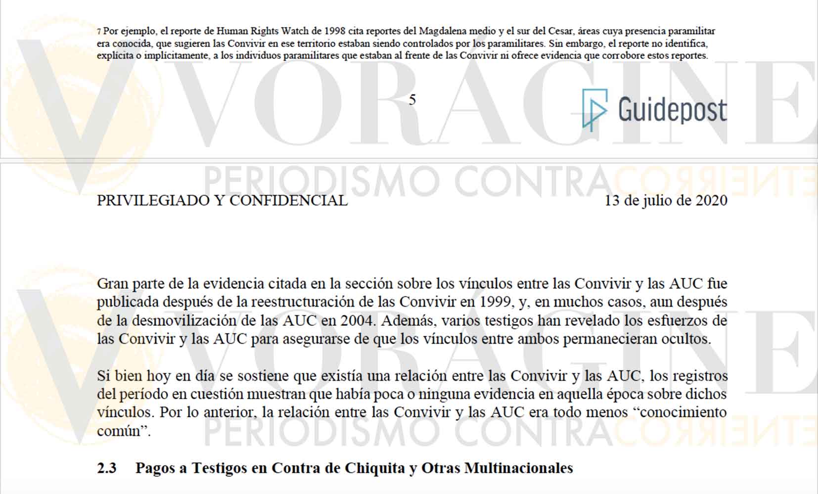 Uno de los documentos presentados por la defensa de los bananeros en el juicio fue elaborado por la empresa Guidepost. El informe está fechado el 13 de julio de 2020 y tiene el rótulo “Privilegiado y confidencial”. VORÁGINE accedió a las 55 páginas de ese archivo.
