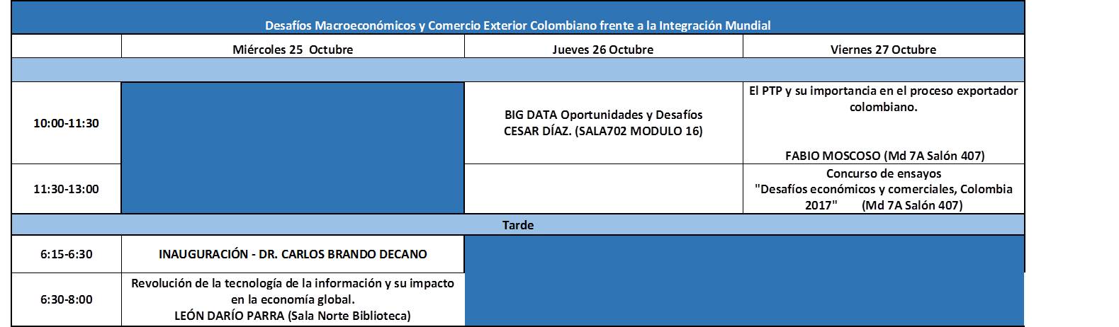 ConferenciaSEMANA DEL COMERCIO INTERNACIONAL Y ECONOMÍA 2017Fecha del evento: Miércoles, Octubre 25, 2017 - 06:15Fecha fin del evento: Viernes, Octubre 27, 2017 - 13:00 Compartir en Dirección de MercadeoEntrada libre programacion_semana_de_comercio.jpg