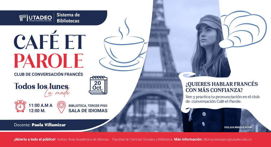 | Si eres estudiante o te interesa aprender, compartir o fortalecer tus conocimientos en el idioma francés te invitamos a unirte todos los lunes en la Biblioteca 3 piso, sala idiomas al club de conversación en fránces dirigido por la profesora Paola Villamizar desde las 11:00 a.m. hasta las 12:00 m. |