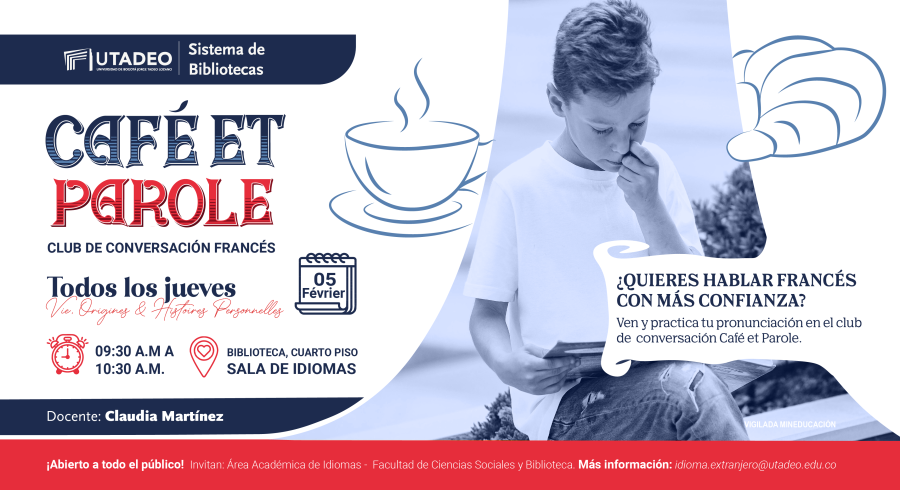 Si eres estudiante o te interesa aprender, compartir o fortalecer tus conocimientos en el idioma francés  te invitamos a unirte todos los lunes en la Biblioteca 3 piso, sala idiomas al club de conversación en fránces dirigido por la profesora Claudia Martínez desde las 9:30 a.m. hasta las 10:30 a.m.