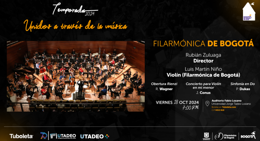 En su temporada 2024, la Filarmónica de Bogotá, junto a la propuesta cultural de la Universidad Jorge Tadeo Lozano UTADEO+, te esperan en este gran concierto, bajo la dirección de Rubian Zuluaga y el violín de Luis Martín Niño. este viernes 18 de octubre a las 7:00 pm en el Auditorio Fabio Lozano