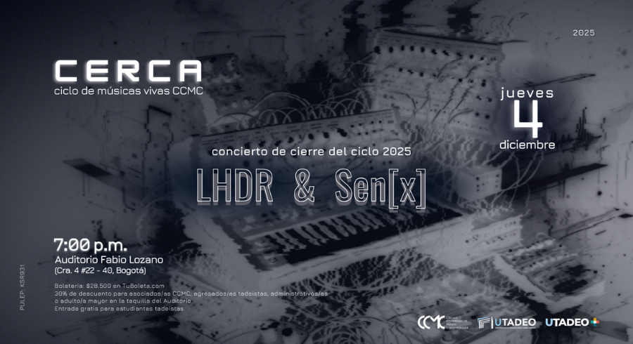 LHDR & SEN(X) es una noche dedicada a la exploración sonora más arriesgada de la escena contemporánea. LHDR, proyecto fundado en 2023 por Hernán Guzmán y Juan David Guerrero, fusiona sonido e imagen mediante improvisación, síntesis, modelado 3D y live coding, creando paisajes inmersivos que dialogan entre lo visual y lo auditivo. Su presencia en espacios como Voltaje, Toplap y el Festival Imagen-Sonido, así como la publicación de su primer disco con Bogotana Records, los posiciona como una de las apuestas más sólidas de la electrónica experimental en Colombia.