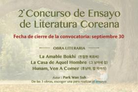 ConcursosSeptiembre 10 / 2018¿Te gusta leer literatura y expresar tus opiniones? Entonces, participa en el Concurso de literatura coreana 2018. Tienes la oportunidad de obtener premios por: 500, 300 y 200 dólares.