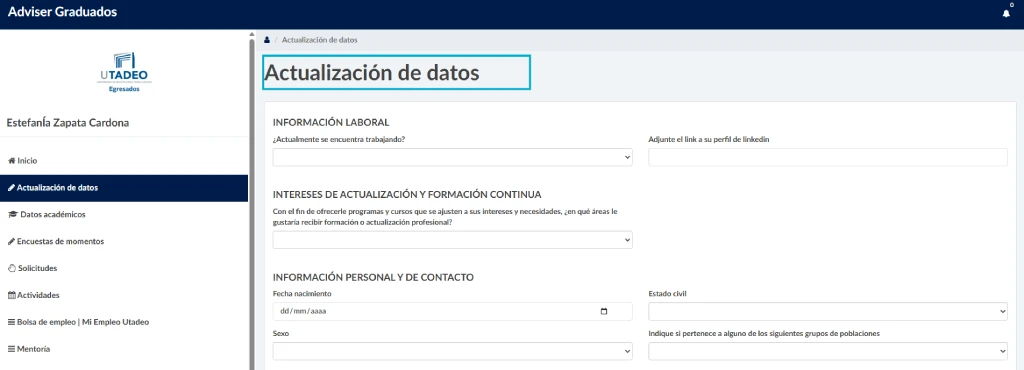 1. Actualicen sus datosen el sistema de información “Conecta Egresados”. https://conectaegresados.utadeo.edu.co/app/login_page.php