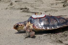 Esta tortuga caguama es compañera de Ami en su aventura por el Caribe colombiano. Podemos conocer su ruta migratoria gracias al uso de un transmisor satelital instalado en su caparazón.