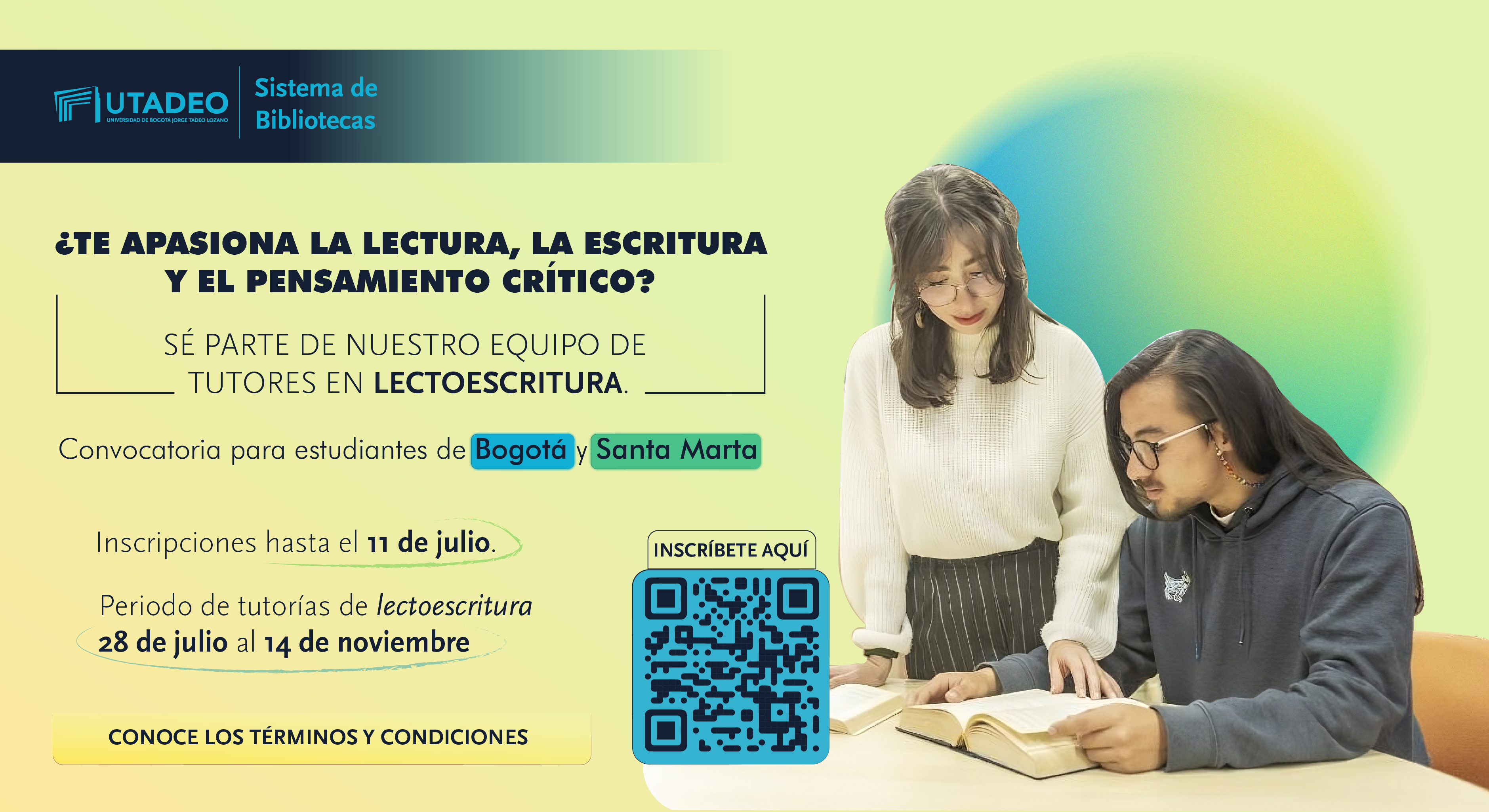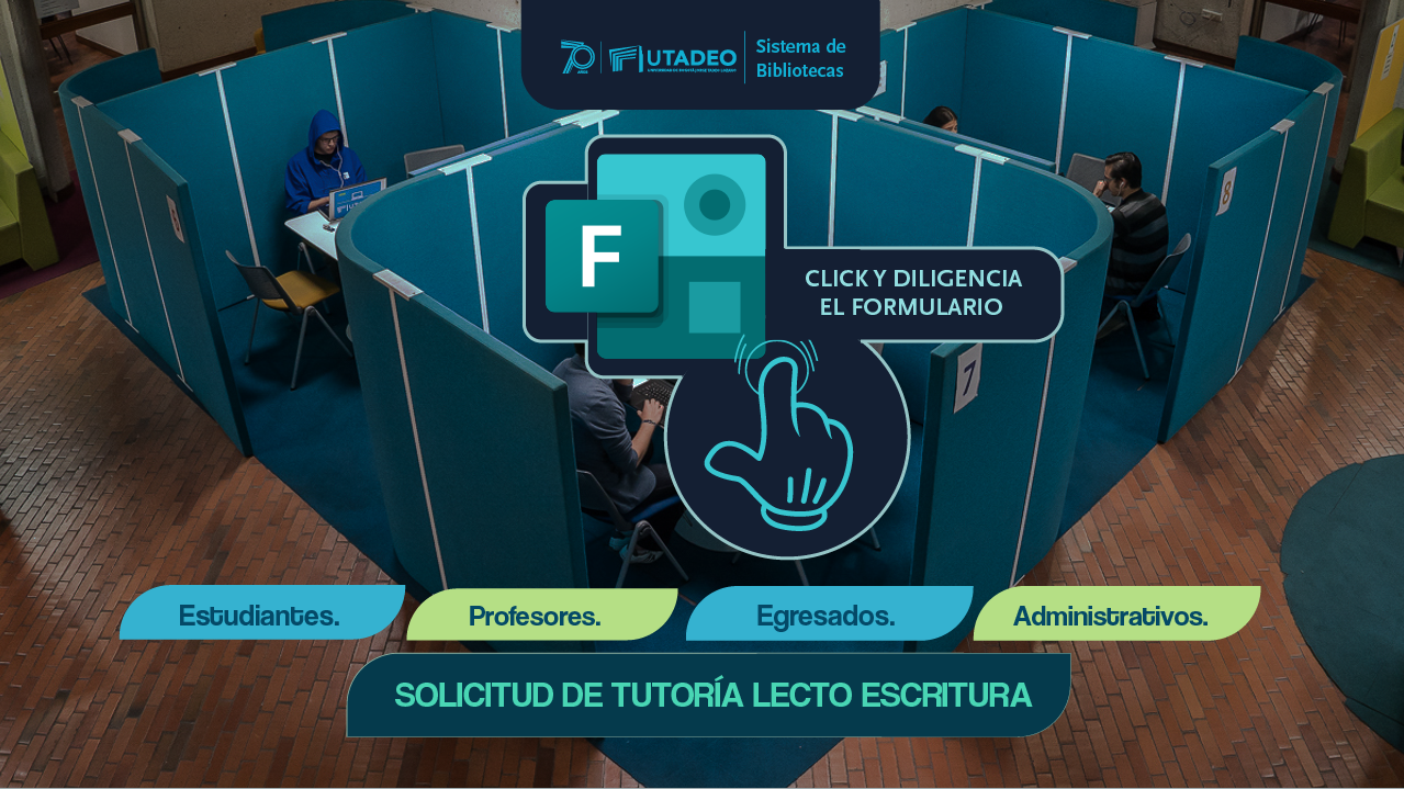 Las tutorías de lectoescritura es un servicio gratuito ofrecido por la Biblioteca de la UTADEO. Son realizadas por estudiantes activos que se encuentran capacitados para proveer asistencia en pregrados y posgrados. Los apoyos que brindan los tutores tienen como propósito ayudar al estudiante con la elaboración de productos escritos de todas las temáticas, esto por medio de acompañamiento y asesoría, donde el tutor ayudará al estudiante a mejorar sus habilidades de lectoescritura. El servicio puede solicitarse para cualquier producto escrito, desde informes de laboratorio y artículos científicos, hasta bitácoras y reseñas, incluyendo sus respectivas pautas de citación y referenciación. Adicionalmente, se puede realizar la petición de un servicio que no esté especificado en el formulario de reserva, como técnicas de lectura o escritura narrativa. ![]() |
