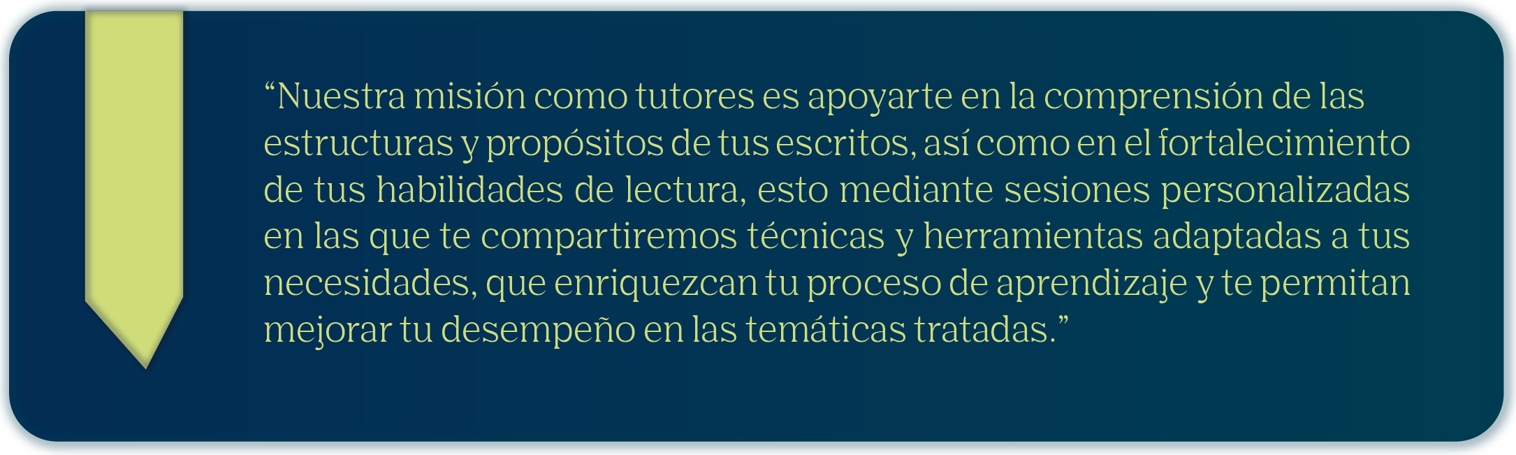 La Vicerrectoría Académica y la Biblioteca han dispuesto un espacio de trabajo, donde contarás con el acompañamiento de estudiantes calificados, dispuestos a ayudarte a mejorar tus competencias en indagación, comprensión y producción de textos. Estamos dispuestos a ayudarte, ¡Agéndate, te esperamos! Los tutores son estudiantes previamente seleccionados por su buen desempeño académico en el área de lectoescritura. Recibieron capacitación para realizar funciones de acompañamiento propias de un tutor y para coordinar actividades con profesores. A continuación, te compartimos el perfil de nuestros tutores. |