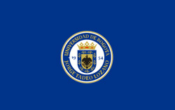 ![]() | La Bandera original de la universidad presentaba dos franjas horizontales, una de color verde (en la parte superior) y otra negra (en la parte inferior). Sin embargo, en el año 2001, fue modificada toda en azul con el Escudo en el centro, en la reunión del Consejo Directivo. Acta No. 19, Diciembre 1 de 2001 |
