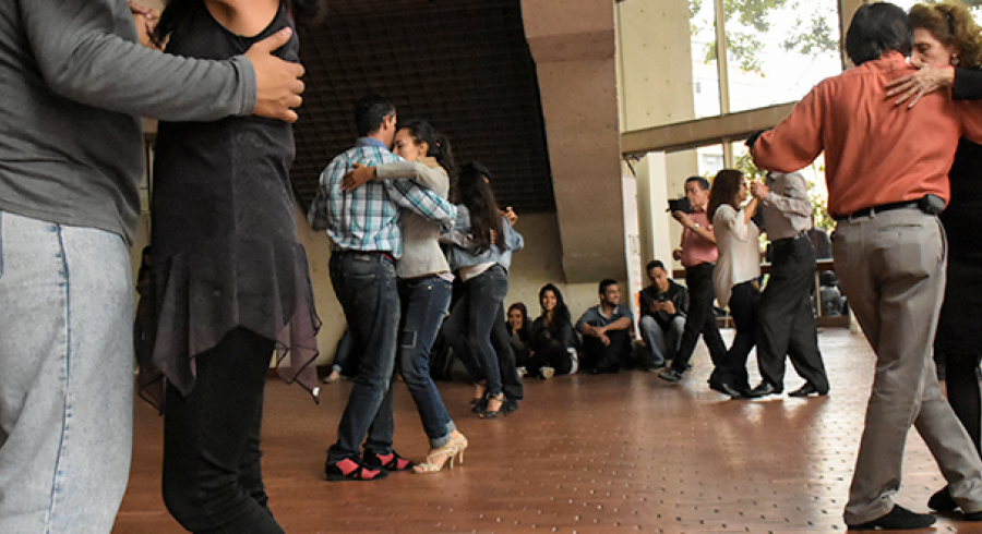 La milonga es un tipo de baile, un ritmo musical y un lugar o evento en el que el tango, el vals y la milonga son los reyes. Esa milonga, en sus tres formas, se vivió en el primer piso del edificio de la Biblioteca de la Universidad Jorge Tadeo Lozano, en la que los profesores Juan Felipe Franky y Gonzalo Baquero invitaron a tadeístas y al público en general a bailar, a mover sus pies y a dejarse abrazar. |