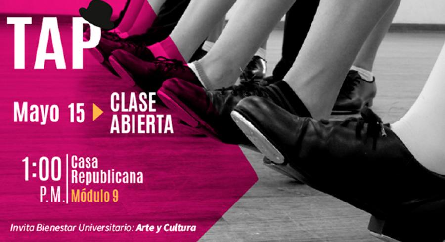 Bienestar Universitario desde su área de Arte y Cultura ofreció el martes 15 de mayo en la Casa Republicana el taller TAP DANCE que consiste en dar un entrenamiento que propone un espacio de estudio, aprendizaje y cualificación de la técnica de este estilo de baile. En este nivel de principiantes, se enfocó en la introducción de fundamentos con un énfasis musical direccionado hacia el swing desarrollando el sentido rítmico aplicado a la danza.