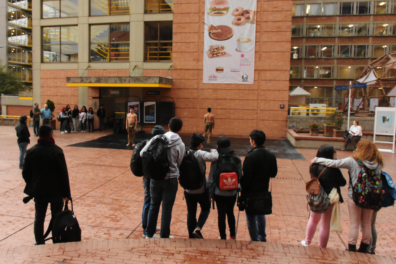 A pesar de la lluvia, Juan David Cárdenas Ramírez y David Santiago Tocarruncho Torres (integrantes del grupo de danza contemporánea de la Universidad Nacional) se presentaron con éxito en la entrada de Utadeo, con el fragmento “Del Hombre de Vitruvio a Spencer Tunick”.