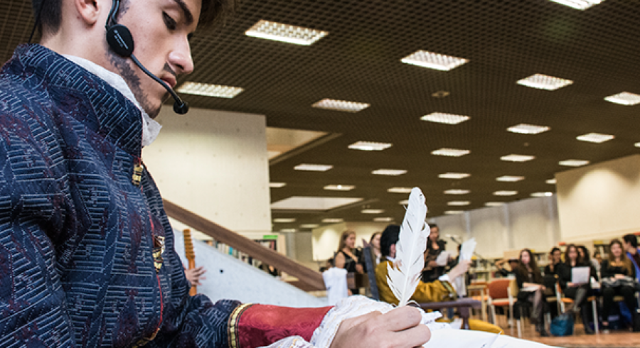 Una de las formas con las que cuenta el Centro de Arte y Cultura para despertar el interés y motivar el conocimiento por la vida y obra de importantes figuras del arte y la cultura, es motivar la participación de los jóvenes tadeístas en la franja de homenajes. Más de 100 estudiantes de diversos programas académicos vinculados, algunos, a los grupos artísticos de la Universidad y otros a la cátedra de lingüística II hicieron parte de un montaje escénico que buscó, a partir de la vida particular de cada escritor, evocar algunos momentos y re-crear fragmentos de su obra literaria. | Oscar Iván Lasprilla, por ejemplo de Cine y TV, encarnó a Cervantes con un tono adusto y enérgico “Este que veis aquí, de rostro aguileño, de cabello castaño, frente lisa, de alegres ojos y de nariz corva, de barbas de plata, bigotes grandes, la boca pequeña, algo cargado de espaldas y no muy ligero de pies; éste, digo que soy yo Miguel de Cervantes Saavedra” autor de La Galatea y de Don Quijote de la Mancha". Jairo Alonso Parra García, estudiante de Publicidad, revivió a Shakespeare a través del Soneto a Silvia y fragmentos del monólogo de “Ser o no ser” con una pronunciación de un inglés británico impecable. |