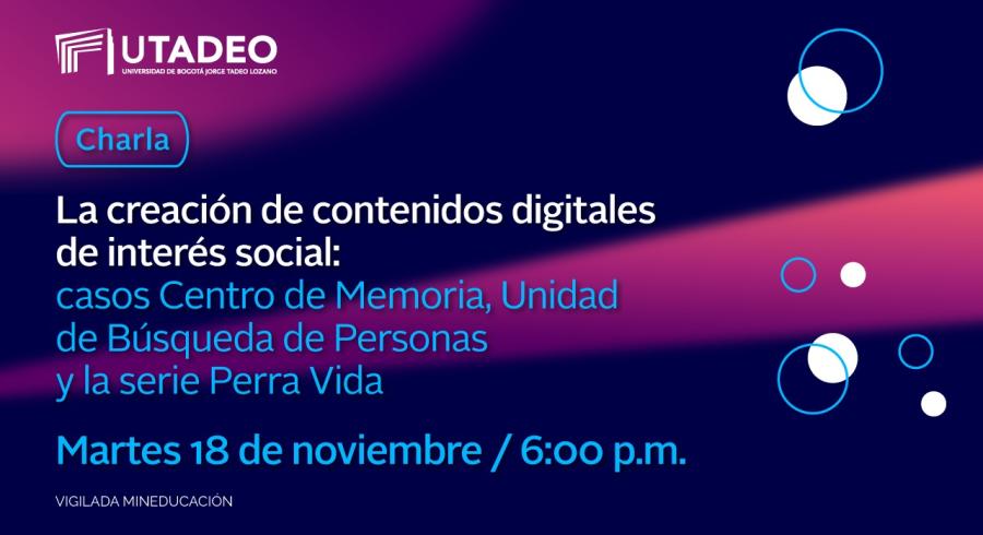 En el marco de su agenda académica, la Maestría en Generación y Gestión de Contenidos Digitales de la Universidad de Bogotá Jorge Tadeo Lozano invita a la charla “La creación de contenidos digitales de interés social: casos Centro de Memoria, Unidad de Búsqueda de Personas y la serie Perra Vida”.