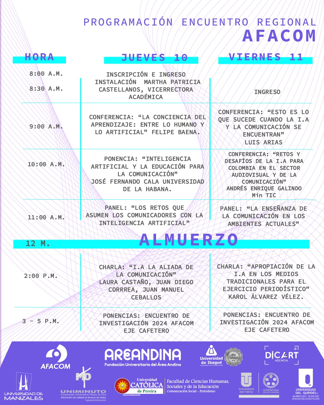 El encuentro regional titulado 'Inteligencia Artificial + Comunicación: uniendo mundos a través de la Creación Asistida', contará con la participación de diferentes instituciones, incluyendo la Fundación Universitaria del Área Andina, la Universidad de Ibagué, la Universidad del Tolima, la Universidad del Quindío, la Universidad Católica de Pereira, la Universidad de Manizales y la Corporación Universitaria Minuto de Dios.