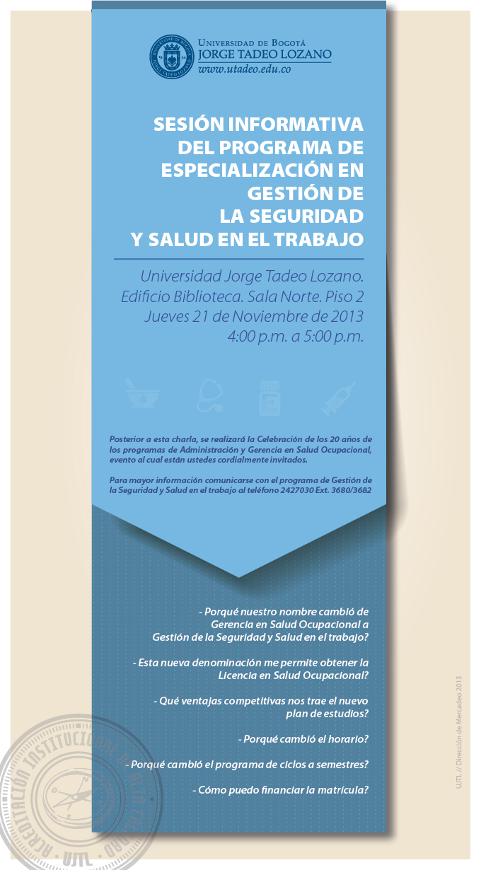 El programa de Especialización en Gestión de la Seguridad y Salud en el Trabajo invita a los interesados en cursar el programa a una sesión informativa que se llevará a cabo en el Edificio de Biblioteca, Sala Norte, Piso 2. El jueves 21 de noviembre de 4:00 a 5:00 p.m.. El objetivo es responder las dudas relacionadas con el cambio del nombre del programa, las ventajas del nuevo plan de estudios, la duración de la especialización, el horario y la financiación de la matrícula.