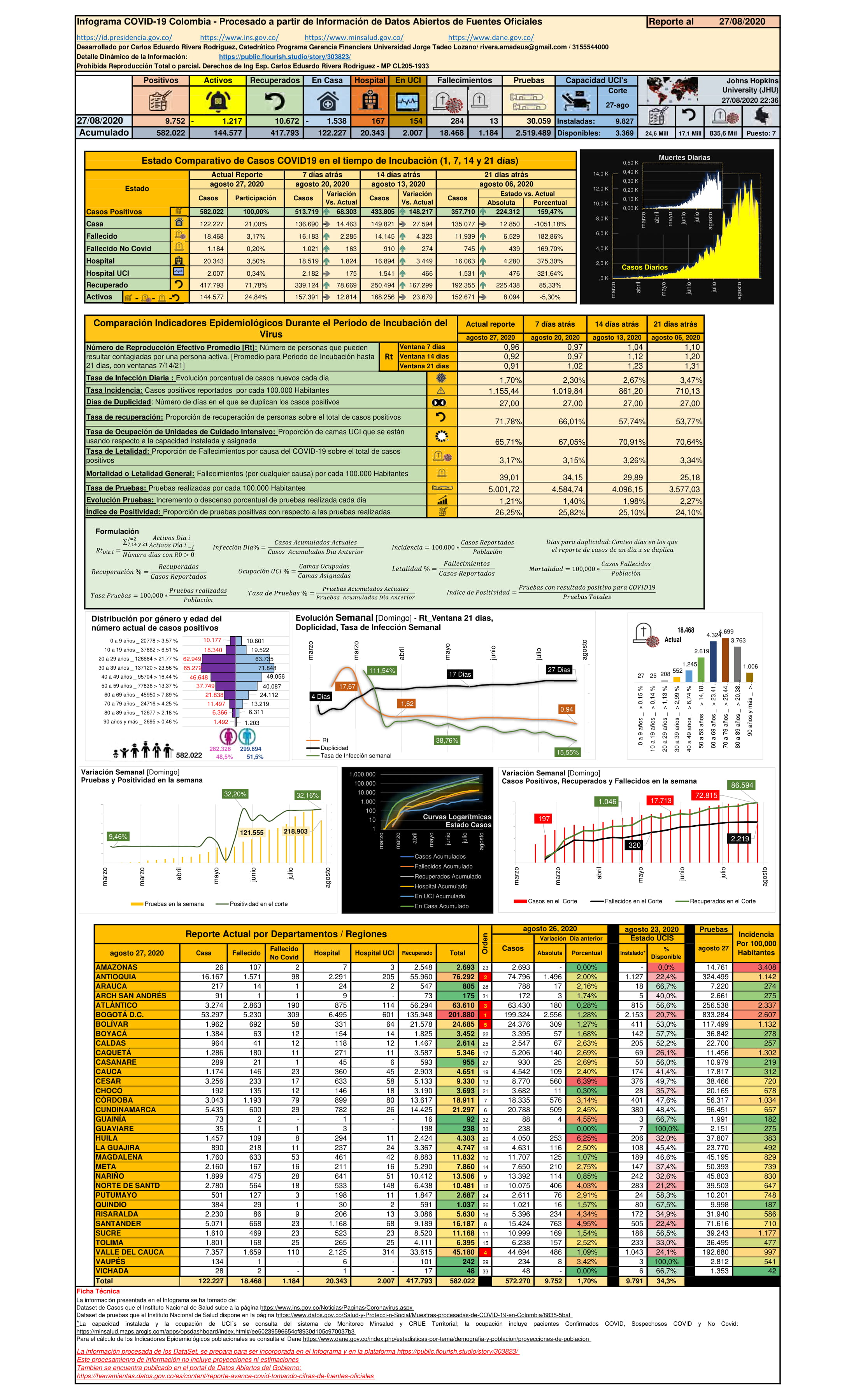 - La incidencia a nivel regional que mide el número de casos por cada 100.000 habitantes muestra al Amazonas con 3.408 casos, seguido por Bogotá con 2.607 casos y en tercer lugar Atlántico con 2.337 casos. La velocidad de reproducción efectiva a nivel regional (Rt promedio) es: Amazonas 0,96; Villavicencio 1,09; Cali 1,09; Santa Marta 1,13; Cartagena 1,08. Bogotá con 201.880 casos [22.340 en una semana], Antioquia con 76.692 [9.259 en la semana] y Atlántico con 63.610 casos [1.339 en las semana] son las tres regiones con mayor nivel de afectación.