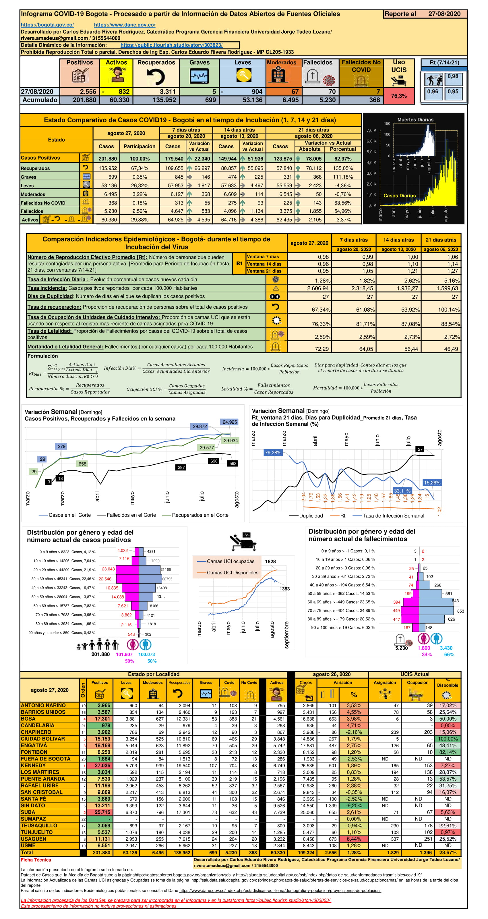 - Bogotá, al 27 de agosto, alcanzó la cifra de 201.880 casos positivos (22.340 en la semana) y 60.330 casos activos. Se han recuperado 135.952 personas (26.297 en la semana) y han fallecido 5.230 (583 en la semana).