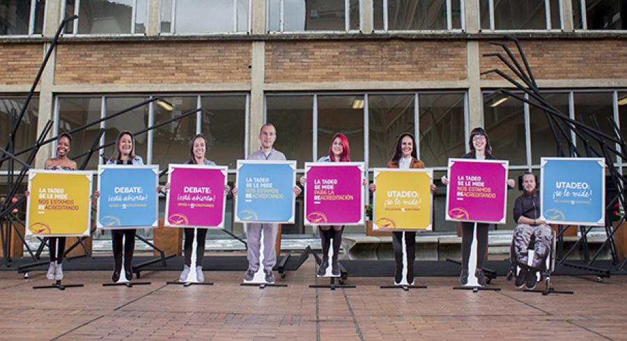 Esta semana fueron ubicados, en diversos lugares del campus de la Tadeo en Bogotá, otros ocho rompe tráficos o tropezones, con las fotografías de integrantes de la comunidad tadeísta comprometidos con la divulgación de mensajes de la movilización LA TADEO SE LE MIDE A LA REACREDITACIÓN.