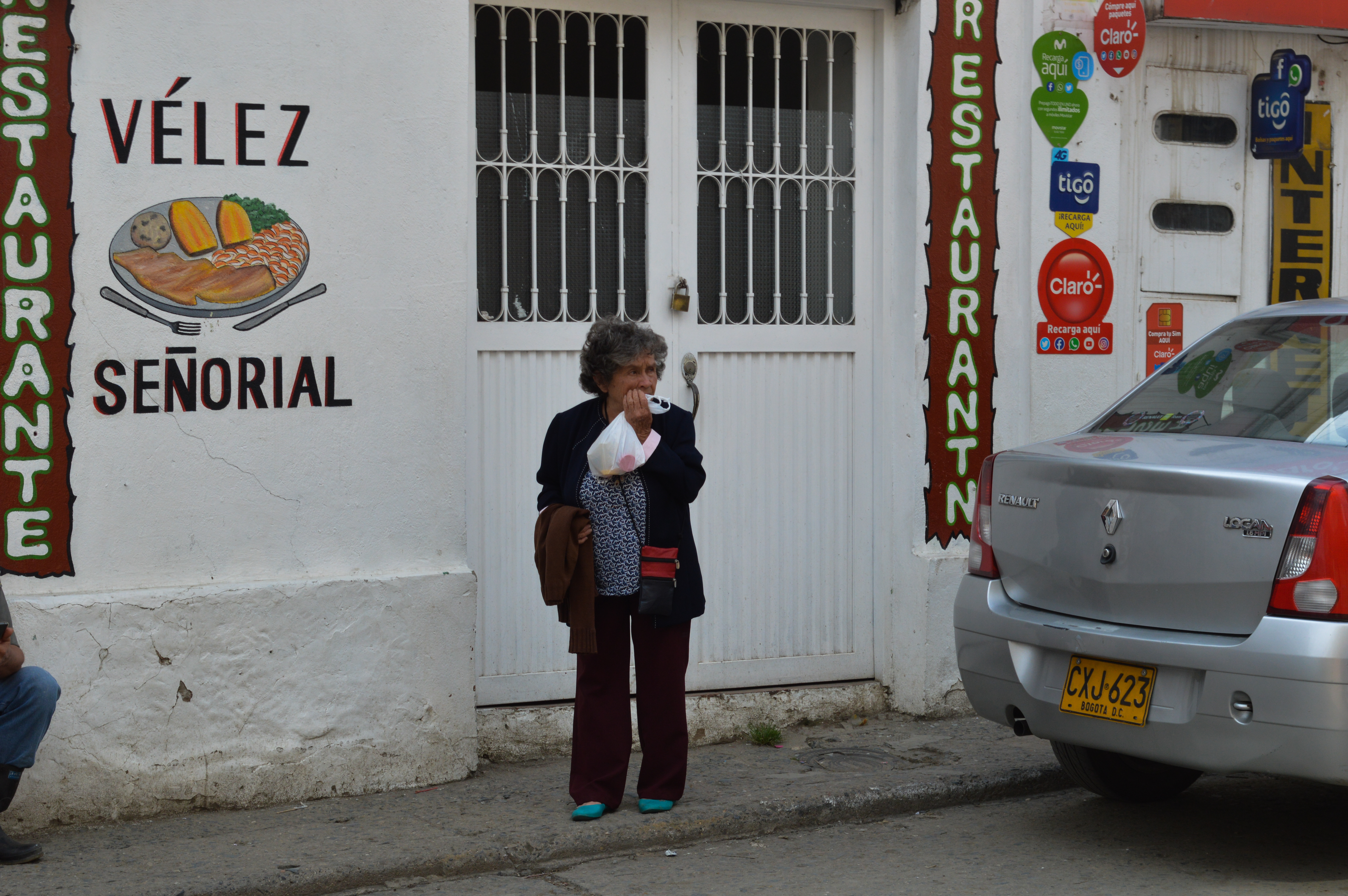 El recorrido en carro es difícil de explicar, soy un pésimo viajero. Almorzamos dos pueblos antes, en Vélez, un lugar increíble; las calles parecían una montaña rusa porque subíamos, bajábamos, giramos por estrechas calles y la gente no respetaba los semáforos. En sus rincones había quienes nos ofrecían camándulas y rosarios.
