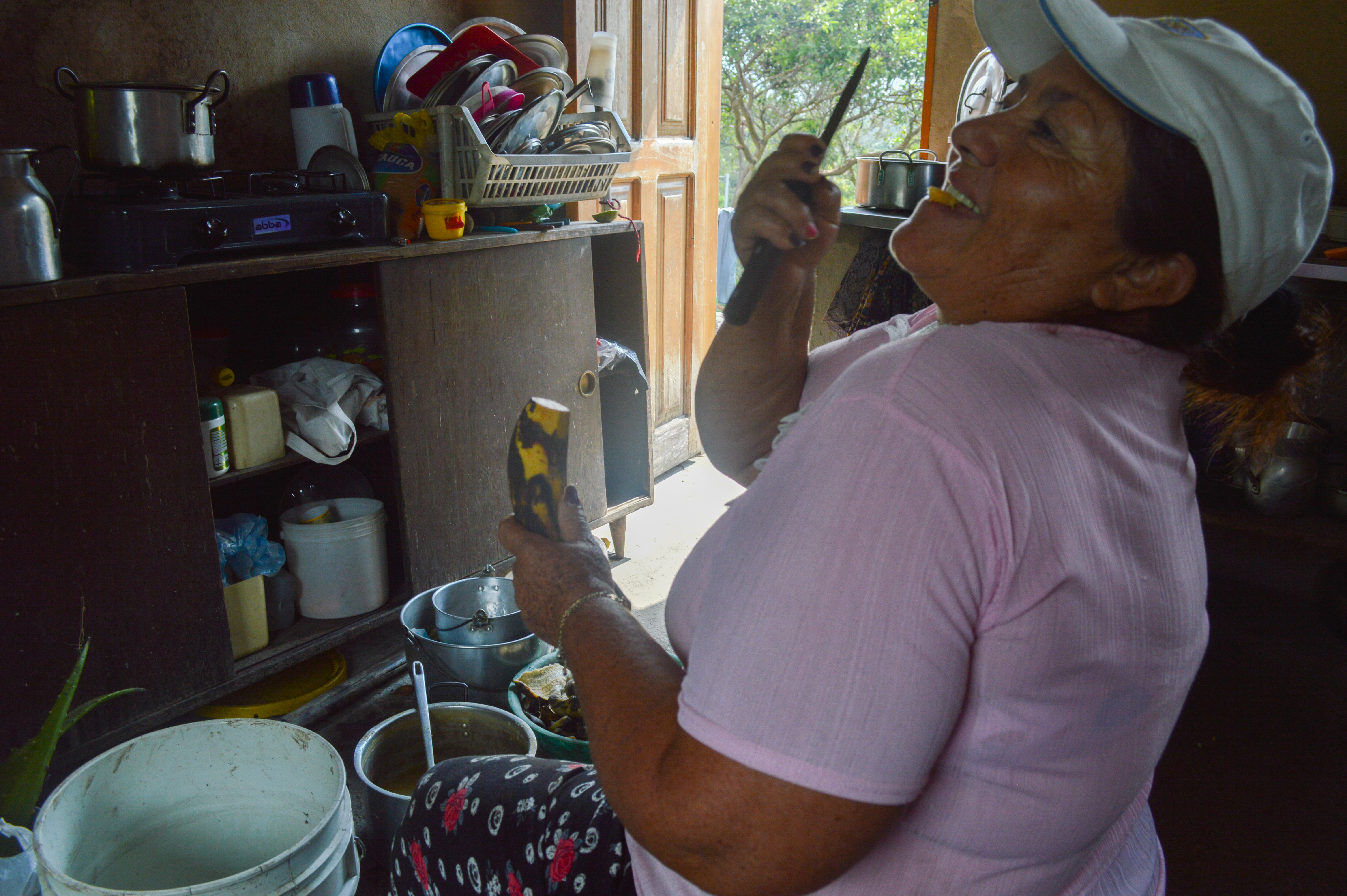 La segunda parada la hicimos en la casa de Marina, una mujer de ojos azules, escasa de dentadura, pero con una sonrisa gigante, que nos invitó a pasar a su casa. Mi tío la bendijo y habló un rato con su hijo mayor. Yo seguía por ahí fotografiando animales, cerdos, loros, gatos... Cuando pasé a la cocina, Marina me invitó a sentar y me dijo que tenía los mismos ojos que mi abuela, yo rápidamente le pregunte de dónde la conocía, cómo sabía de ella y otras interrogantes que salieron de mí sin dejarla responder. Mi padre le contó la historia de mi abuela a Marina. Ella sonrio y aplaudio, estaba llena de dicha, esa misma sensación que mi abuela causaba en mi corazón también lo sentía Marina, que sin conocernos, y nosotros sin haber avisado que íbamos, nos abrió las puertas.