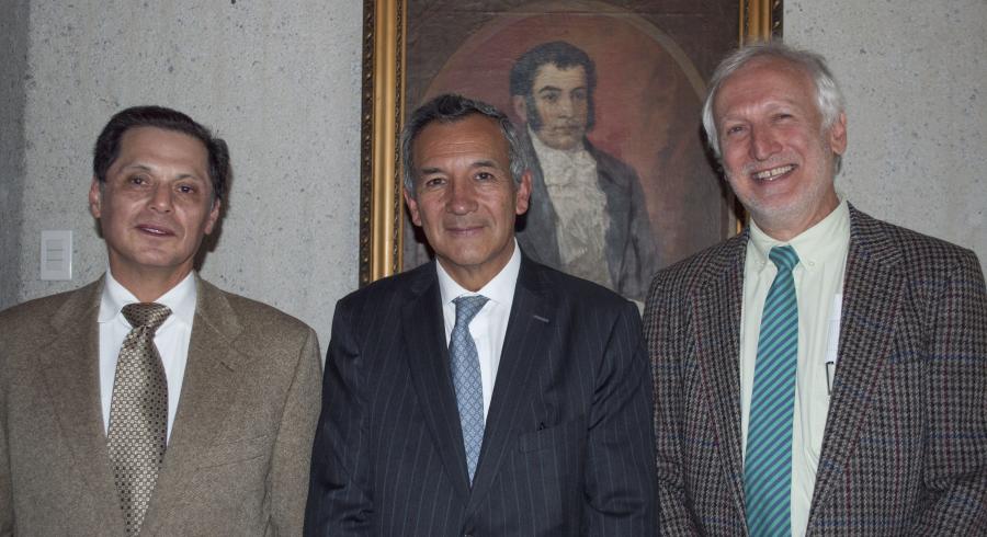 (De izquierda a derecha: Dr Diógenes Campos - Primer Decano de la Facultad de Ciencias Naturales e Ingeniería, Dr Daniel Bogoya - Decano saliente y Dr Isaac Dyner Rezonzew - Decano entrante)