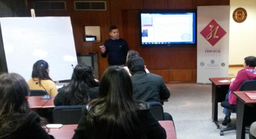 El jueves 20 el Instituto Confucio U.Tadeo llegó hasta la Universidad de la Sabana de la mano del profesor Cuéllar. El evento empezó con una divertida sesión de “Tú nombre en chino” en la que participaron varios estudiantes de la U. Sabana emocionados por ver como la profesora Bai escribía los caracteres. Pero la curiosidad no era solo por los caracteres sino por los cursos de chino, así que antes iniciar con la conferencia nos tomamos unos minutos para contarle al público qué es el Instituto Confucio U.Tadeo, y toda la información sobre los cursos de idioma.