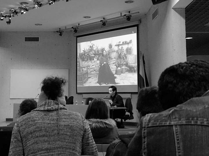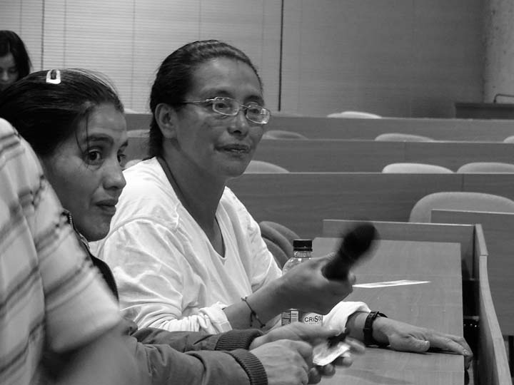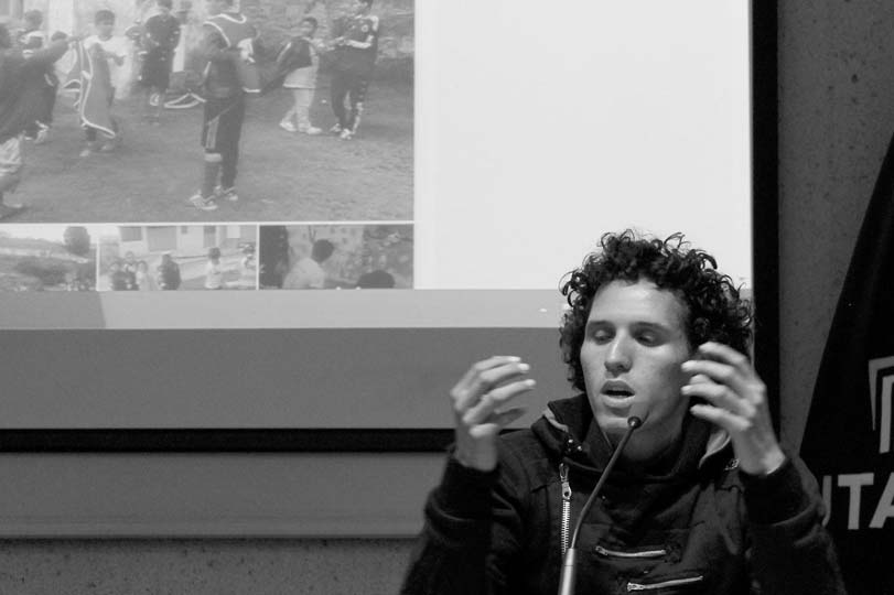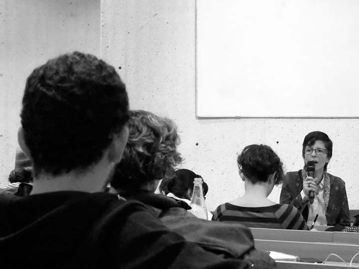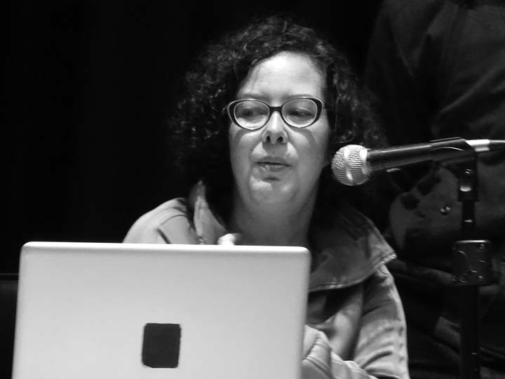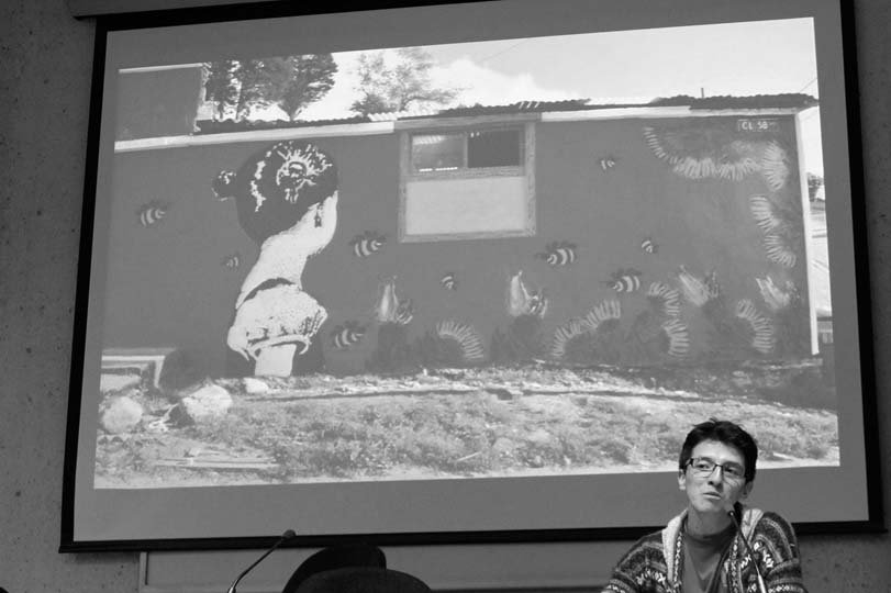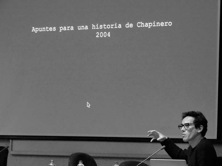 Ximena Vargas presentó el trabajo de Mapa Teatro desde una de sus últimas puestas en escena: Los Santos Inocentes, que surge de una fiesta en la que los hombres se disfrazan de mujeres, se ponen máscaras, salen a las calles y dan látigo a aquellos que no estén disfrazados; este festejo sucede en la población de Güapi, departamento del Chocó (Colombia), cada 28 de diciembre. Ximena se enfocó en una pieza que realizó Mapa Teatro para la Cuadrienal de Praga (uno de los eventos más importantes de escenografía y diseño teatral a nivel mundial), un cruce entre escenografía-instalación-performance, que alude a esta celebración, y que enfrenta al espectador ante la extrañeza de esta imagen: un hombre afrodescendiente disfrazado de mujer, con una máscara sobre su rostro, trepado en un muro levemente inclinado, azota insistentemente un látigo que produce un ruido ensordecedor, y que retumba en toda la sala de exposiciones. Al respecto: “La teatralidad de Mapa Teatro, habitada por enriquecedores procesos contaminantes se aleja radicalmente del concepto tradicional de montaje teatral. Sus creadores y directores, Rolf y Heidi Abderhalden, son artistas que transitan desde las artes visuales al teatro, desarrollando instalaciones plásticas, video-instalaciones, performances y escrituras escénicas que interesan más como experiencias vividas que como representaciones. Ellos han buscado acercarse a los conceptos de la plástica alejándose de las convenciones de un teatro que gira en torno a un espacio ilusorio, y proponiendo sus trabajos como -actos específicos-, efímeros e irrepetibles.” (fragmento del texto Indigencias cotidianas y escenarios de lo real en el arte escénico colombiano, de Ileana Diéguez).