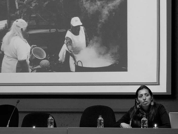 Jaime Barragán, artista y gestor comunitario, hizo alusión a los conceptos de Soberanía y Cultura a través de la lectura de un relato de su autoría, referido a la preparación de dos tipos de alimentos característicos: la “ensalada” y la “sopa”. A través de esta lectura Jaime reflexionó sobre las formas de cooperación que conllevan a la construcción de lo colectivo, a la defensa de los territorios y de la diversidad cultural: las afiliaciones, vecindades, participaciones, colaboraciones, etc. en las que entre todos se crea un sentido de lo comunitario y lo que emerge es un conjunto indisociado de deseos, ideas y concepciones que constituyen el cuerpo social, con una “sazón” particular; en contraposición, la suma de subjetividades que se encuentran y unen para impulsar un conjunto de intereses en los que cada quien es visible por su condición diferenciada y, sin embargo, deben tener en cuenta sus “sabores” respectivos para intuir las cualidad específicas del plato que se preparará.