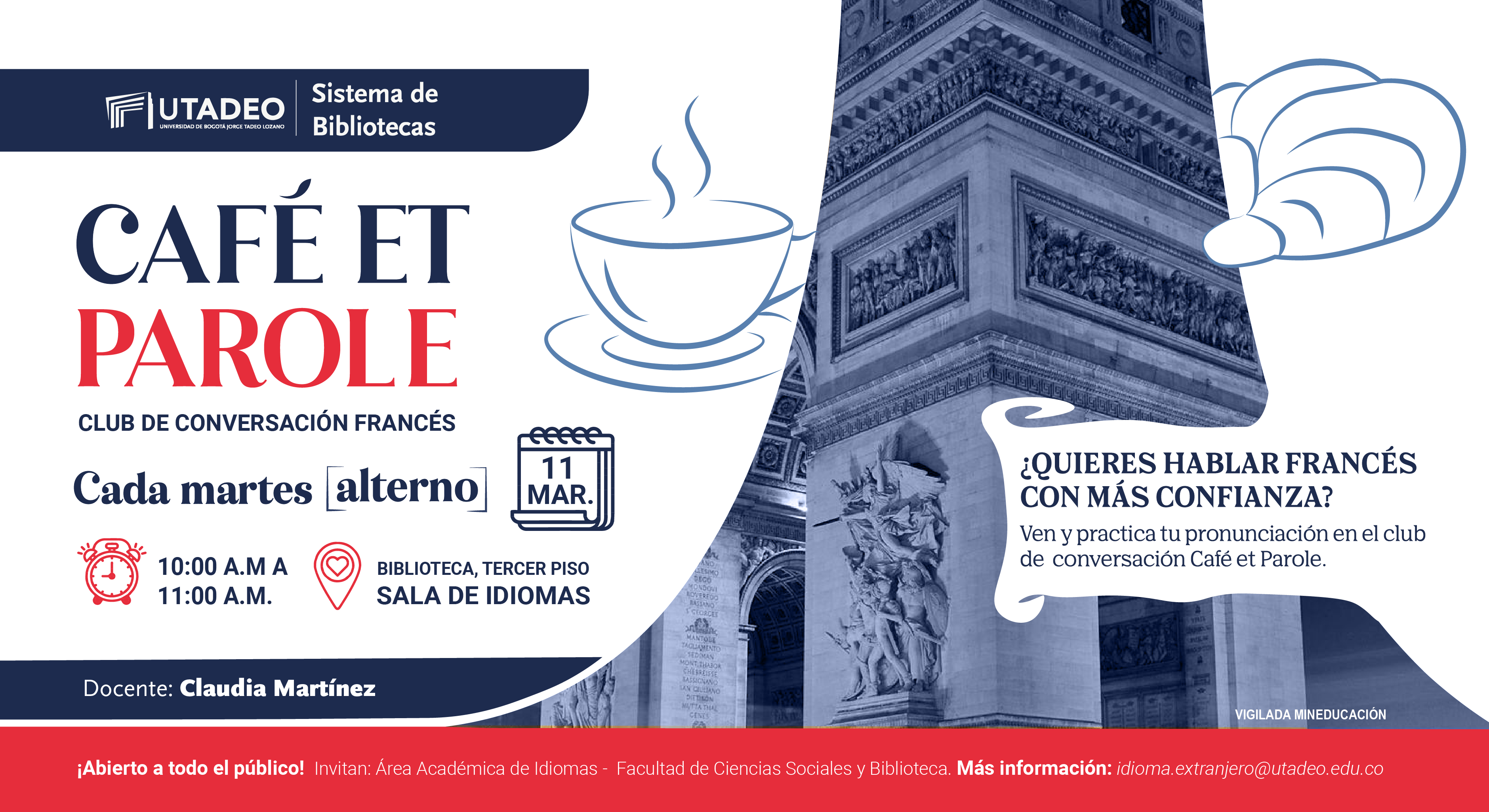 Café et parole - Club de conversación en francés Fecha:martes 11 de marzo | | Hora:11:00 a.m. a 12:00 m. | | Lugar:Biblioteca 3 piso, sala idiomas | Martes 11 de marzo