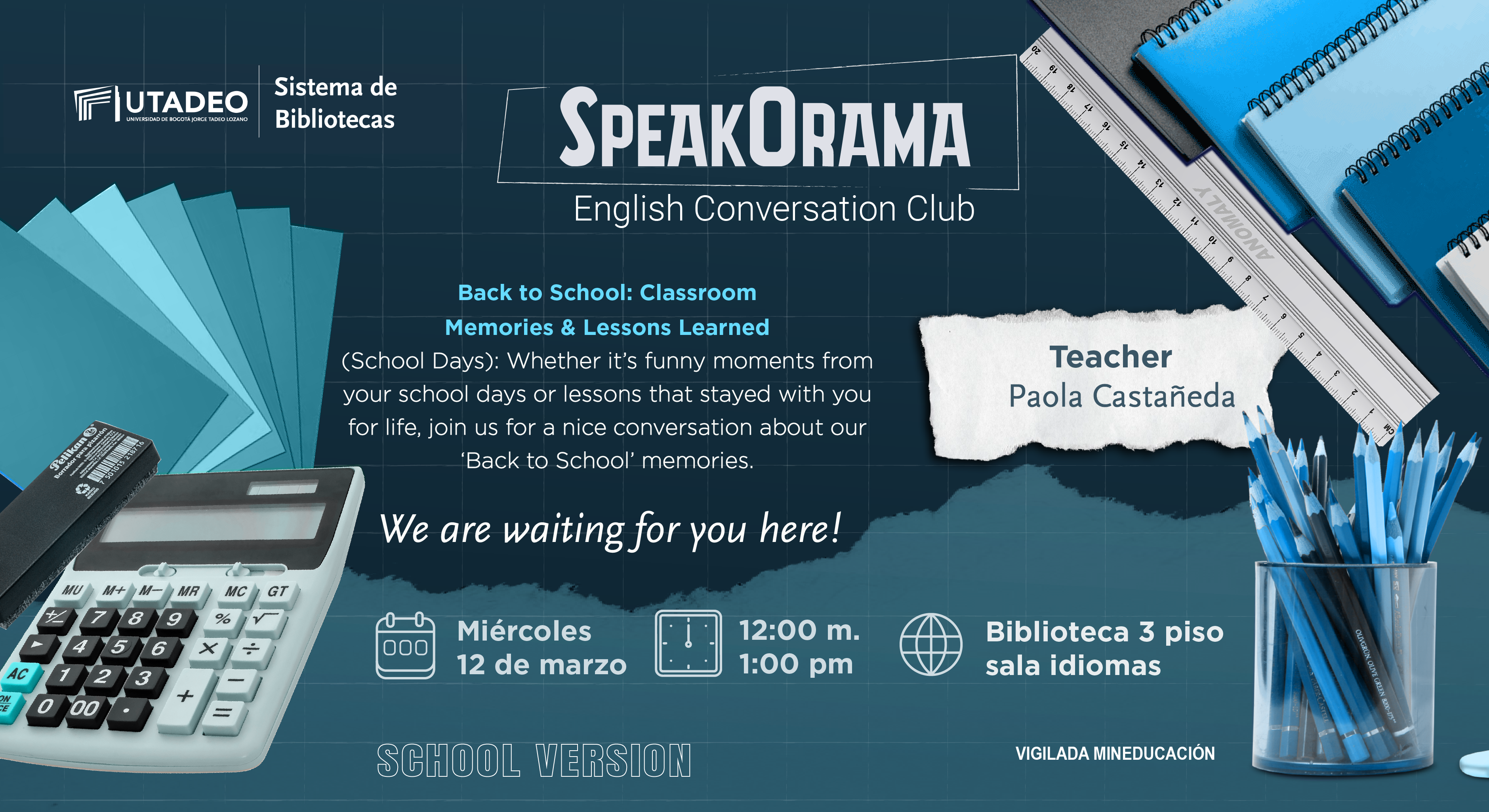 SpeakOrama - Club de conversación en inglés Fecha:jueves 12 de marzo | | Hora:12:00 m. a 1:00 p.m. | | Lugar:Biblioteca 3 piso, sala idiomas | Jueves 13 de marzo