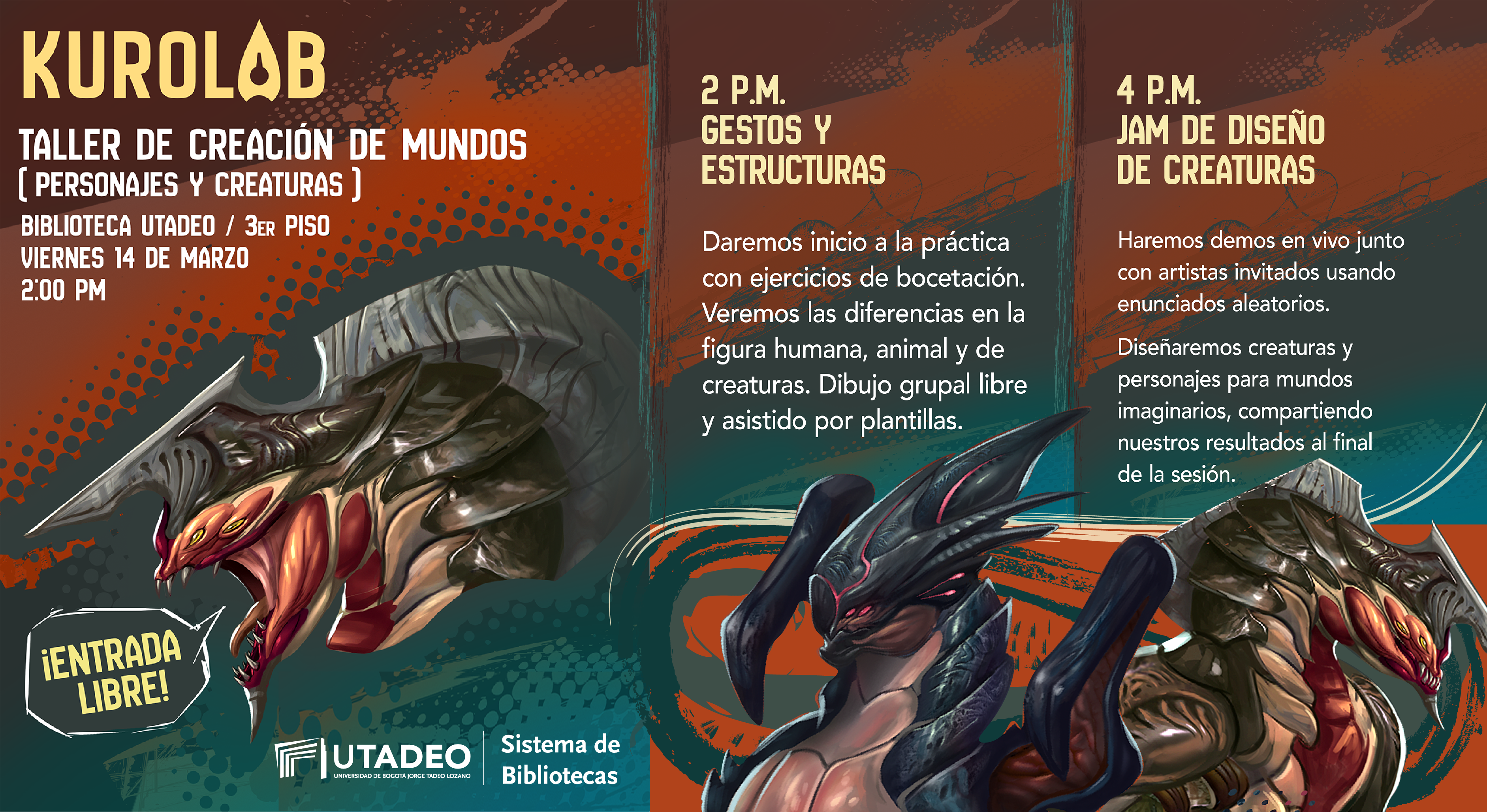 Kurolab - Taller de creación de mundos Fecha:viernes 14 de marzo | | Hora:2:00 p.m. a 5:00 p.m. | | Lugar:Biblioteca, 3 piso sala de exposiciones | Viernes 14 de marzo