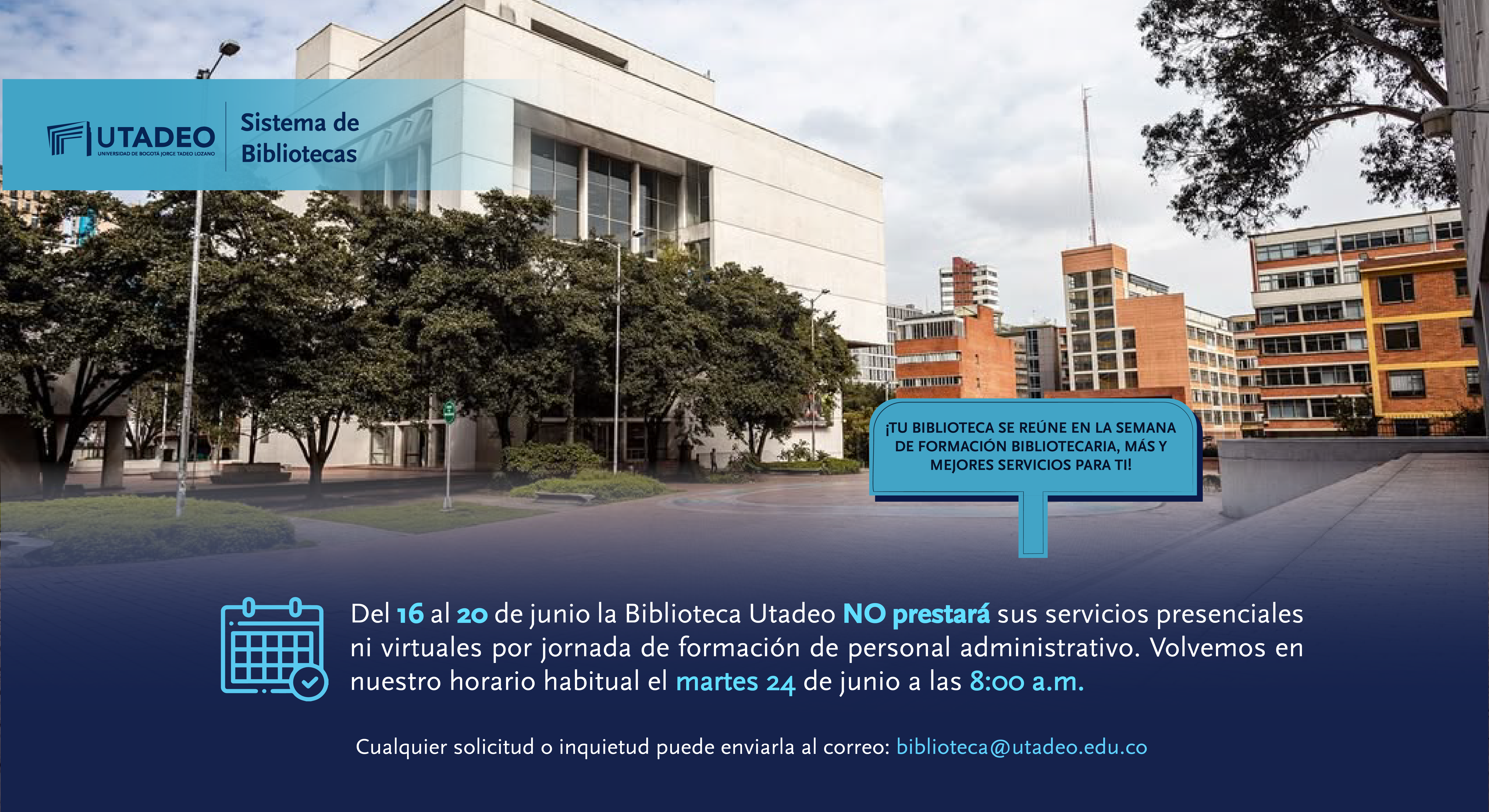 Fecha:lunes 16de junio | Hora:Jornada mañana: 9:00 a.m a 2:00 p.m.Jornada tarde: 2:00 p.m. a 5:00 p.m. | Lugar:Biblioteca Utadeo, 2 piso hemiciclo |