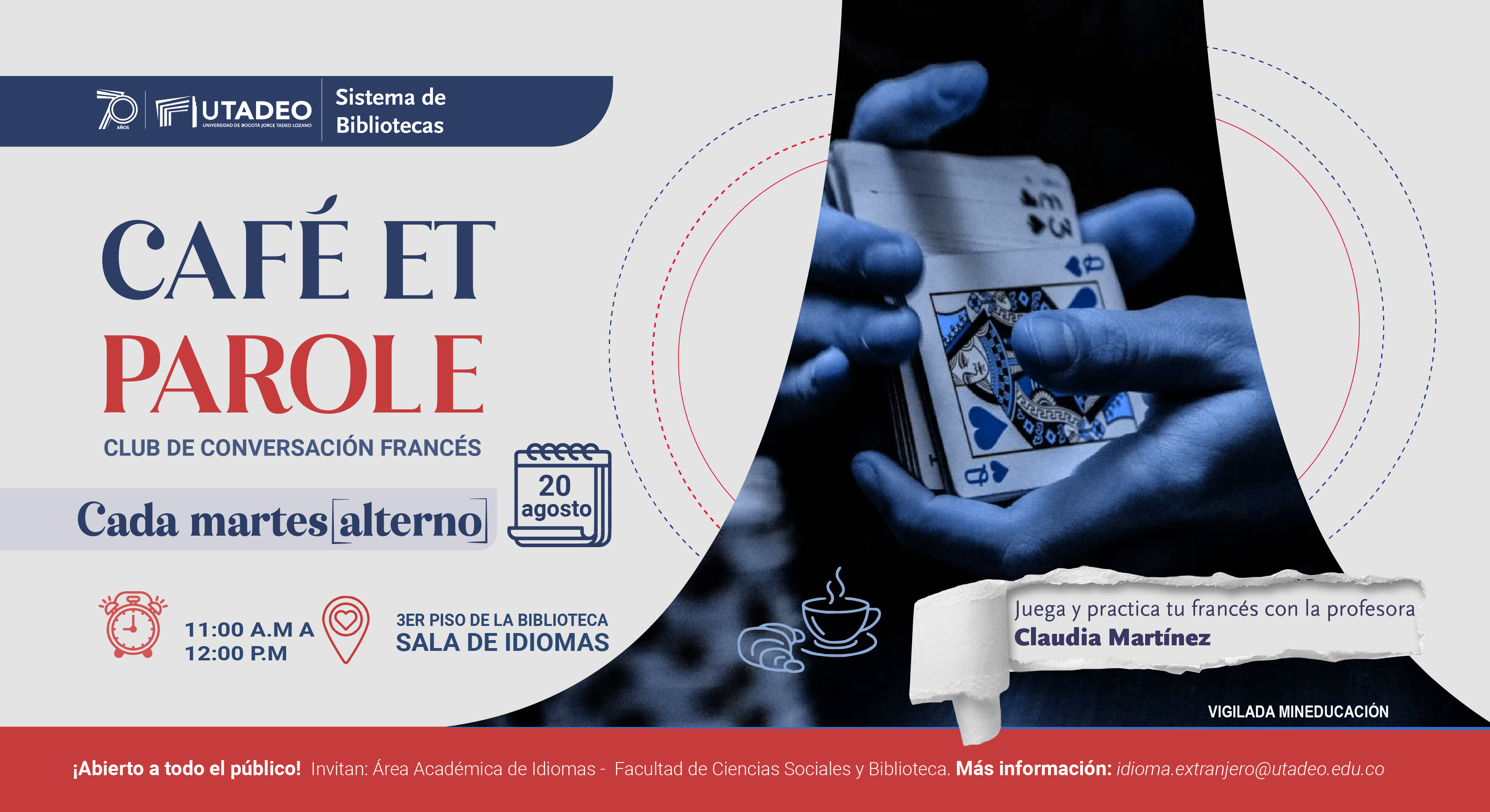 Fecha:miércoles 21 de agosto | Hora:11:30 a.m. a 12:30 p.m. | Lugar:Biblioteca 3 piso, sala de idiomas |