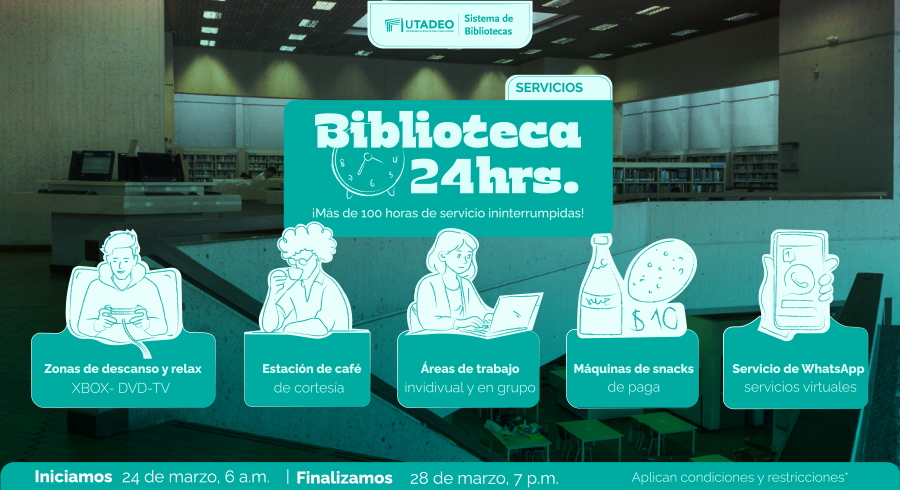 Servicio exclusivo para la comunidad tadeísta (estudiantes, docentes, administrativos y egresados) La hora máxima de entrada a la Biblioteca será a las 11 pm y la hora de salida será a partir de las 6 am del día siguiente. Por razones de seguridad, no se permitirá el ingreso o salida de las instalaciones de Biblioteca entre las 11 pm y 6 am del día siguiente Los usuarios que se queden en la jornada nocturna, deberán proporcionar al personal de Biblioteca un contacto de emergencia y/o acudiente responsable Puedes traer tu aperitivo o alimento ligero favorito para pasar la jornada nocturna. No se permitirá solicitar ningún domicilio en general. No se permitirá el consumo, ingreso, ni permanencia de usuarios en estado de alicoramiento ni bajo el efecto de sustancias psicoactivas
