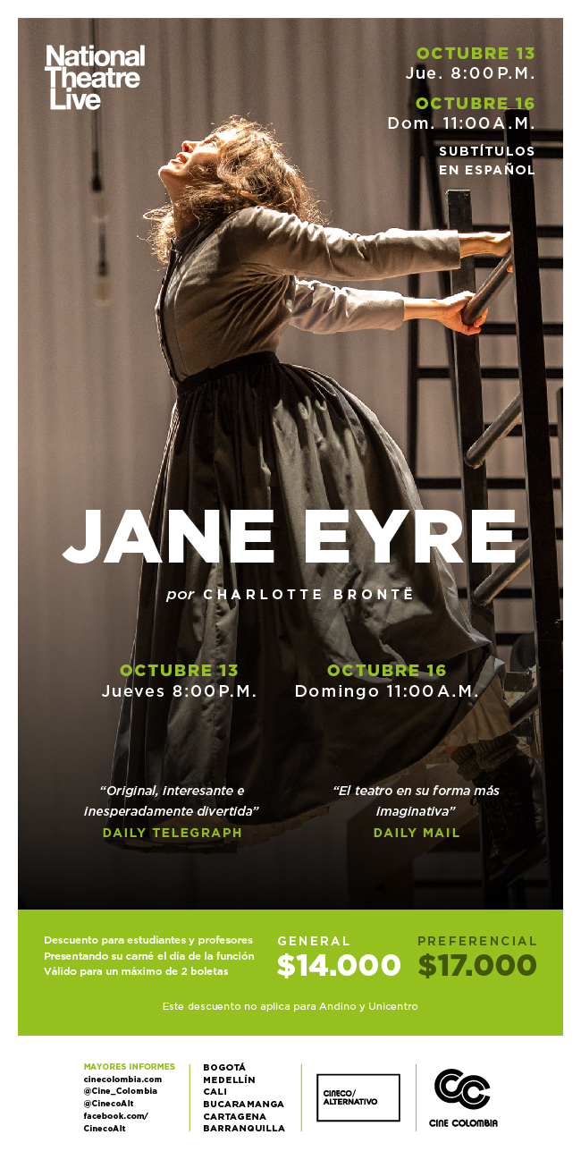 Con alegre y desgarradora música interpretada en vivo por la banda de Benji Bower; vestuario de época, un montaje fresco y luces dinámicas, el National Theatre y el Bristol Old Vic nos presentan una readaptación de la novela romántica Jane Eyre, escrita por Charlotte Brontë hace 170 años. En esta audaz propuesta de la directora Sally Cookson, la historia de la joven huérfana que se convierte en fogosa heroína, sobreviviendo a la miseria, a la injusticia y a la amarga traición antes de seguir los dictados de su corazón, se cuenta entre movimientos coreografiados, ‘coros’ de actores que construyen poderosas imágenes y escenas intensas. Esta obra ‘ardiente y apasionada’ llega el 13 de octubre a Colombia, como parte de la Temporada 2016 del National Theatre Live que se presenta en 11 salas seleccionadas de cine en Bogotá, Cali, Medellín, Barranquilla, Bucaramanga y Cartagena.