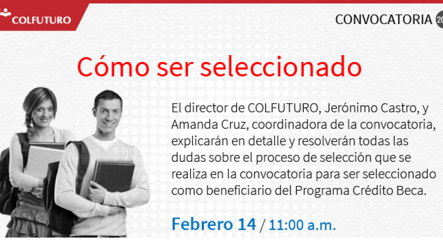 El director de COLFUTURO, Jerónimo Castro, y Amanda Cruz, coordinadora de la convocatoria, explicarán en detalle y resolverán todas las dudas sobre el proceso de selección que se realiza en la convocatoria para ser seleccionado como beneficiario del Programa Crédito Beca.