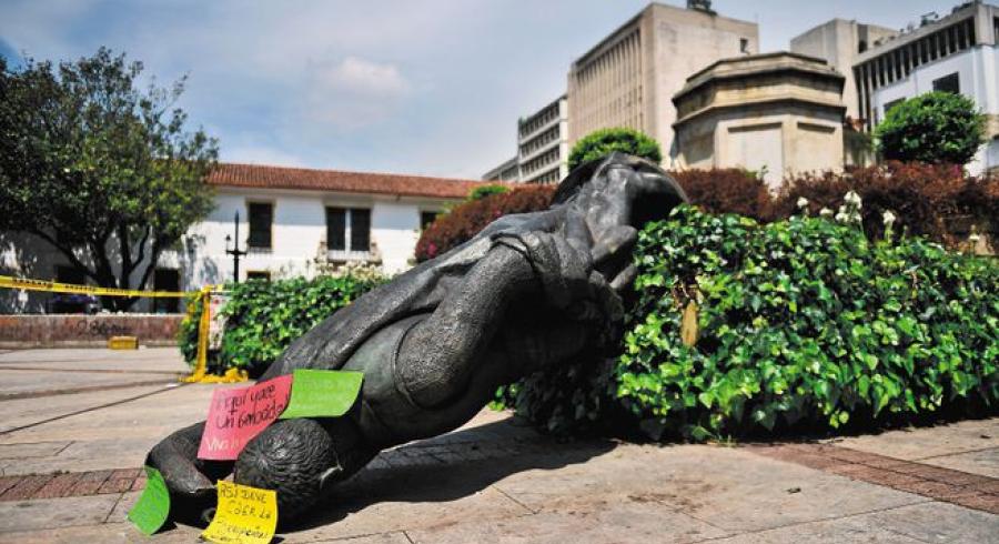 La Universidad del Rosario, en Bogotá, adecuó uno de sus edificios como refugio para albergar a los alumnos que asistieron a las marchas el 5 de mayo, y que no lograron regresar a sus casas por la situación de movilidad. También fue frente a la sede de esta universidad en miembros del pueblo Misak derrumbaron la estatua de Gonzalo Jiménez de Quesada, “quien fue históricamente el más grande masacrador, torturador, ladrón y violador de nuestras mujeres y nuestros hijos”. El Movimiento de Autoridades Indígenas del Sur Occidente, (AISO) describió el acto como la recuperación de uno de sus espacios más sagrados.
