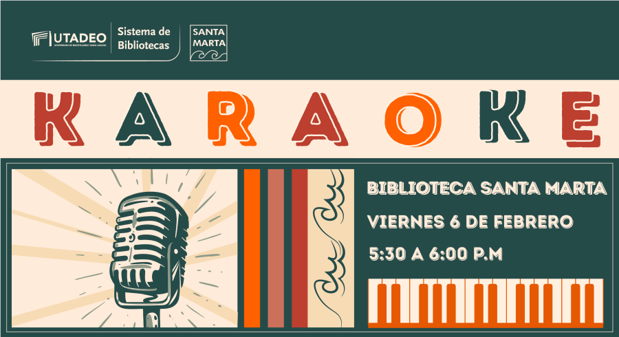 La Bilbioteca Utadeo Santa Marta presenta su primer karaoke tadeísta del primer semestre, ven y demuestra que eres la mejor voz este viernes 6 de febrero a las 5:30 p.m. |