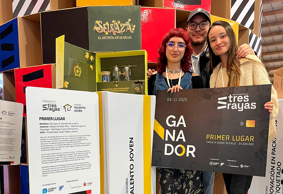 En la más reciente edición del Reconocimiento Tres Rayas de Andina Pack 2025, la Universidad Jorge Tadeo Lozano obtuvo cuatro galardones en las categorías 'Academia–Empresa' y 'Talentos Jóvenes', reafirmando su liderazgo en innovación, sostenibilidad y diseño con propósito social y ambiental.