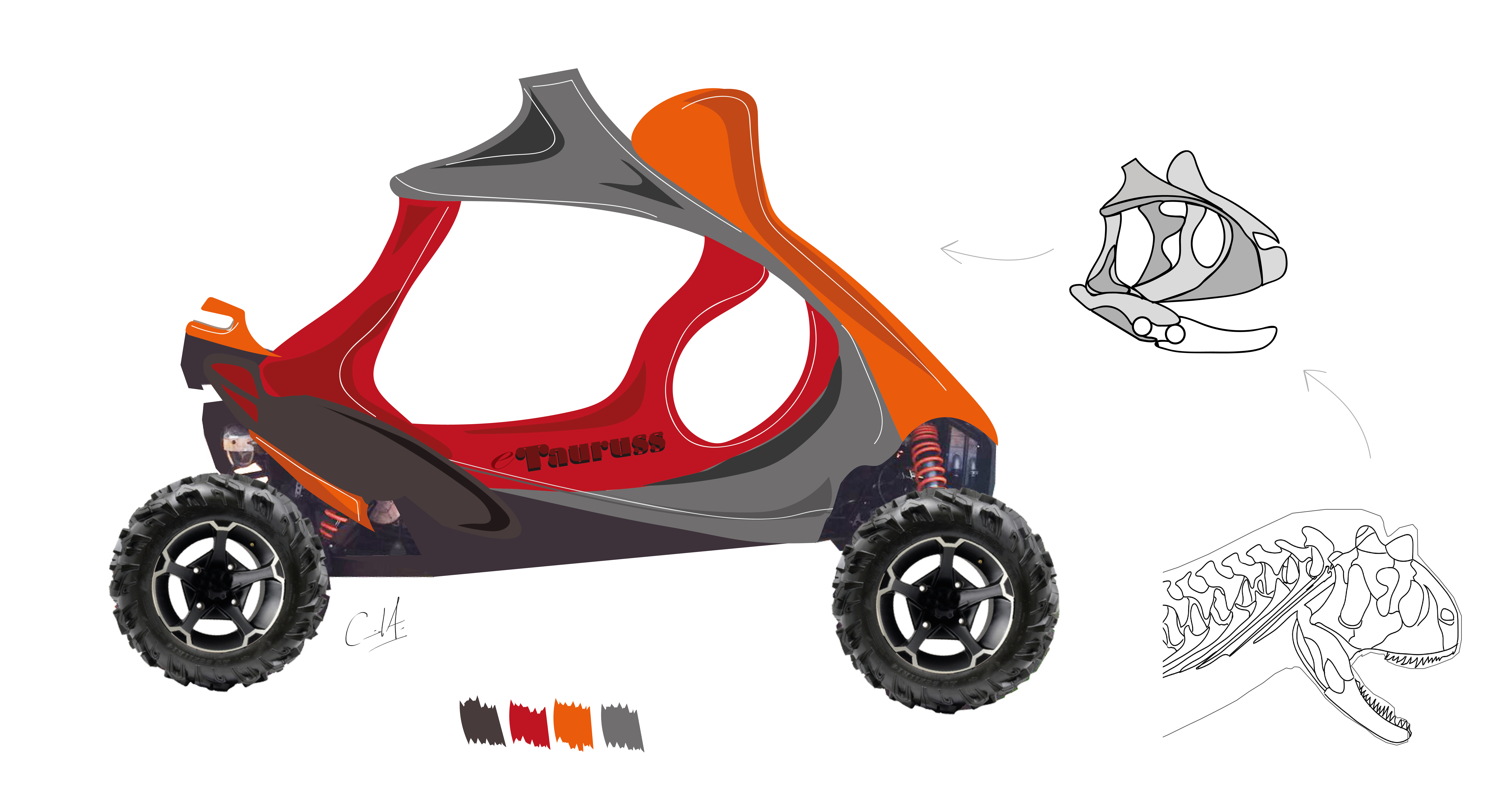 Figura 4: Desarrollo un todoterreno eléctrico (e-Tauruss) desde un primer nivel inspiración visual de las formas y contornos del cráneo del Carnotaurus Sastrei
