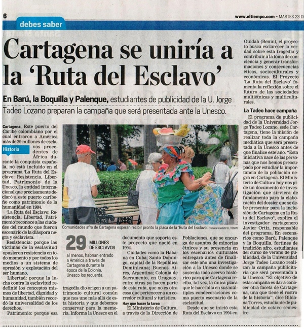 Una nota sobre la posible inclusión de Cartagena en la denominada "Ruta del Esclavo" fue publicada por el periódico El Tiempo este 23 de junio de 2015.